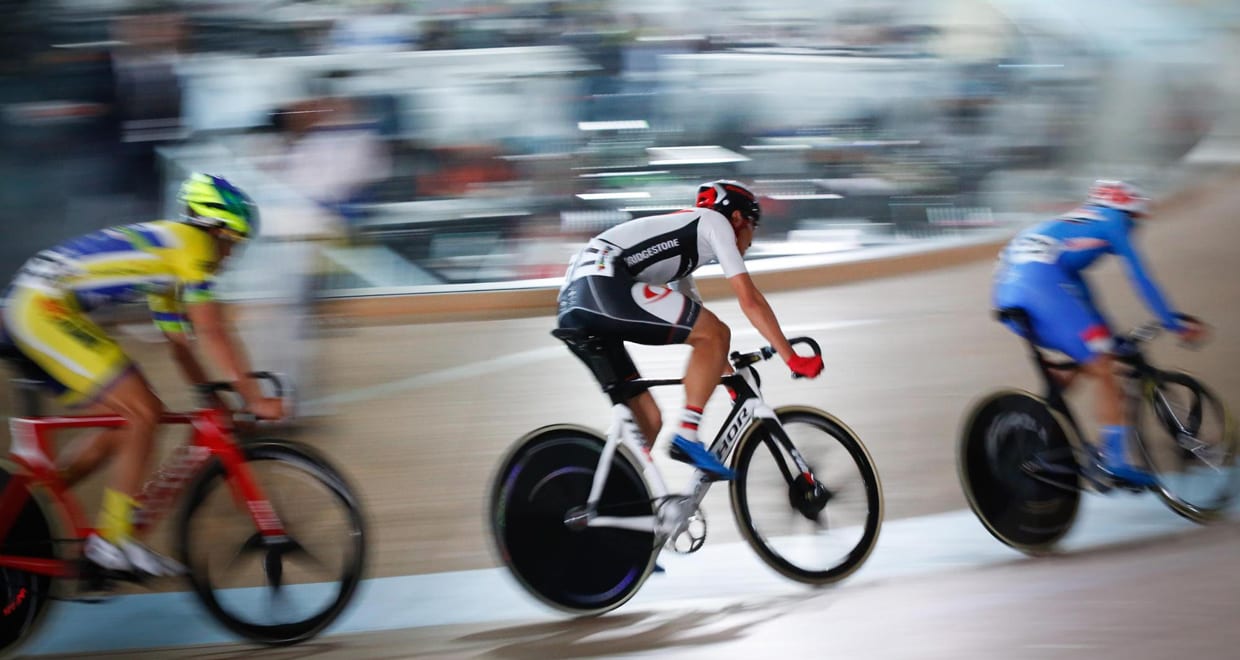 自転車競技場(トラック、バンクとも呼ぶ)で行われる自転車競技のこと。板張り、コンクリート、柔らかいアスファルトなどでできた滑らかな路面で、カーブでスピードを落とさないためにカントという角度(伊豆ベロドロームでは最大45度)がついた設計になっているのが特徴です。国内では1周の長さは250~500mが多い(伊豆ベロドロームは国際基準の250m)。