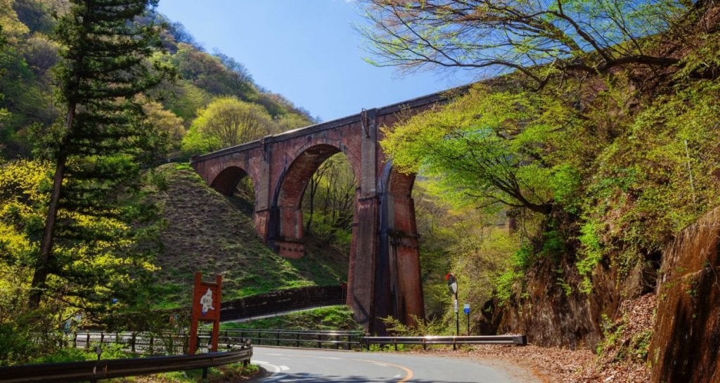 碓氷峠を登り始めて約6km地点(カーブ33)に見えてきます。めがね橋の上は廃線跡(アプトの道)になっていて、歩く事が出来ます。