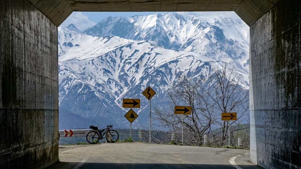 山頂や尾根を覆う純白の残雪と雪解けを迎えて露出した山肌とが織りなすコントラスト、ドラマチックなまでの美しさを見せる北アルプスの姿がそこに。写真を撮ってみると自分のロードの小さなこと! こんなにも北アルプスが近いとは。