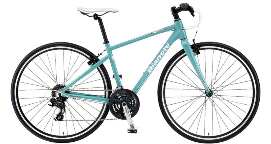 チェレステカラーと呼ばれる爽やか青色が印象的なBianchi(ビアンキ)のクロスバイク。パッと目をひくカラーは乗るときに良い気分になれます。