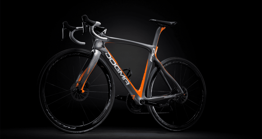 フレームは、エアロダイナミクスと剛性の最高のバランスを実現したフラットバック・プロファイルや、ボトルケージ周辺のエアロダイナミクス特性を改善するコンケーヴ・デザイン、TWIN FORCE シートクランプ、ダブルポジション・ボトルケージマウントなど、DOGMA F10が持つすべての特徴を有している。DOGMA F10とディスクブレーキの統合は、DOGMA F10が持つ最先端デザインをさらに高め、フォーククラウンやバックステーをブレーキダストで汚すこともない。また、UCI公認なので許可されたすべての登録レースに使用可能である。