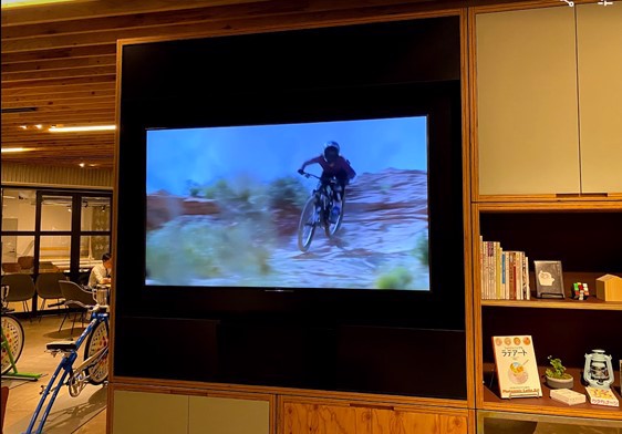 入口から1歩中に入るとスペシャライズドのバイクやエキップメントが展示され、24時間過ごせるパブリックスペース「TAMARIBA」にも映像が流れるなどスペシャライズドの世界観を体感できる。