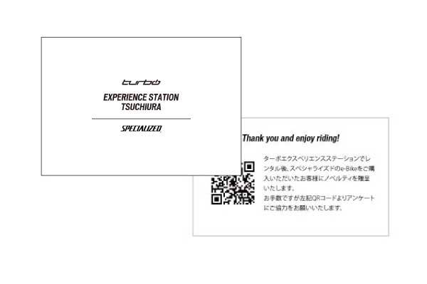 Turbo e-Bikeをレンタルして気に入ったら、全国のスペシャライズド正規販売店、オンラインストアで購入が可能だ。Specialized Turbo Experience Stationでは、レンタル時にカードを渡しており、Turbo e-Bikeを購入後、カード裏面に記載されているQRコードにアクセス&アンケートに協力するとスペシャライズド・ジャパンよりTurbo購入特典の粗品が送られる。