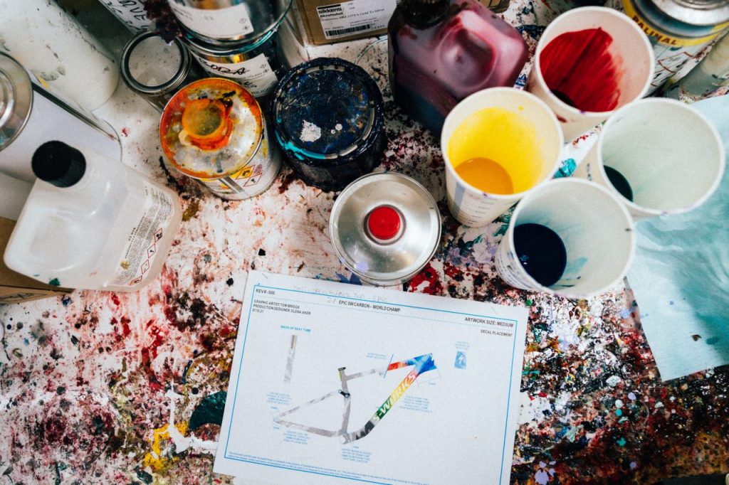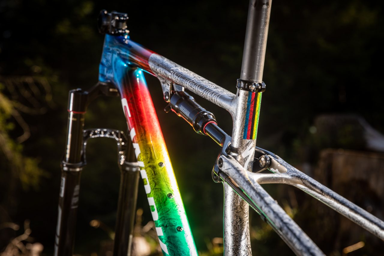 勝利の瞬間に向けたゴールスプリントで、ライダーは意識が朦朧とし視界がぼやけるほどすべての力を振り絞り、ペダルを踏み込みます。ダウンチューブとトップチューブのレインボーカラーのフェード加工は、その霞んだ視界を表しています。花崗岩のようなベースカラーは、思考や感情、トレーニング、そのライダーの人生のすべてがワールドチャンピオンになるという栄光の一瞬のために渦巻いている様子を表現しています。