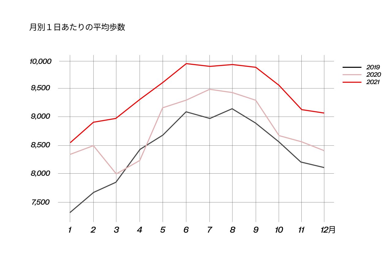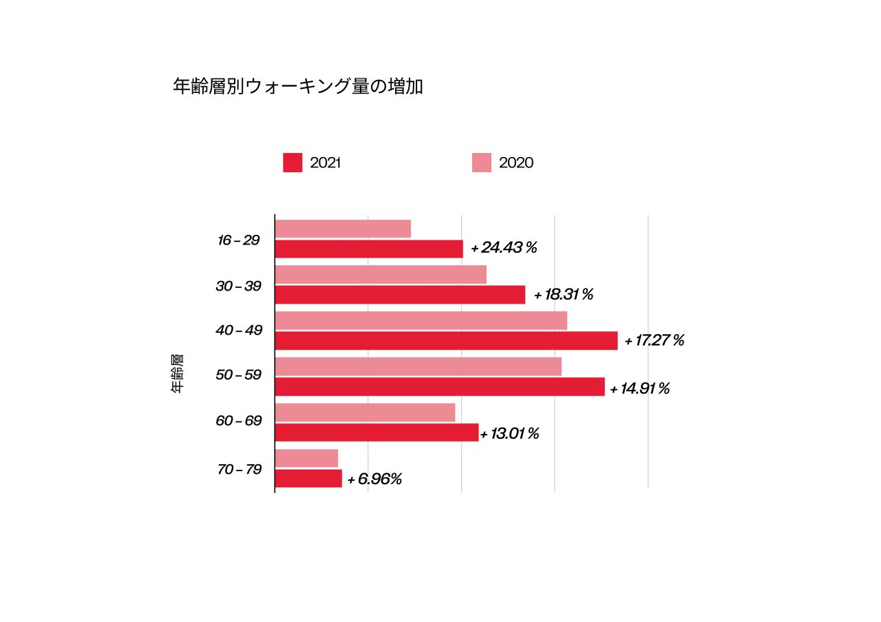 ウォーキングの増加傾向は、ポラールユーザーの1日平均歩数の全体的な増加にもつながっている。2021年の夏に計測されたデータは、1日平均約10,000歩となり、2020年の同じ時期と比較して約500歩多くなっている。この傾向は日本だけでなく、グローバルでも同様に見られる。すべての年齢層における平均でウォーキング1回あたりの距離は平均4.5km、また時間は1時間を超え、約360キロカロリーを消費していた。