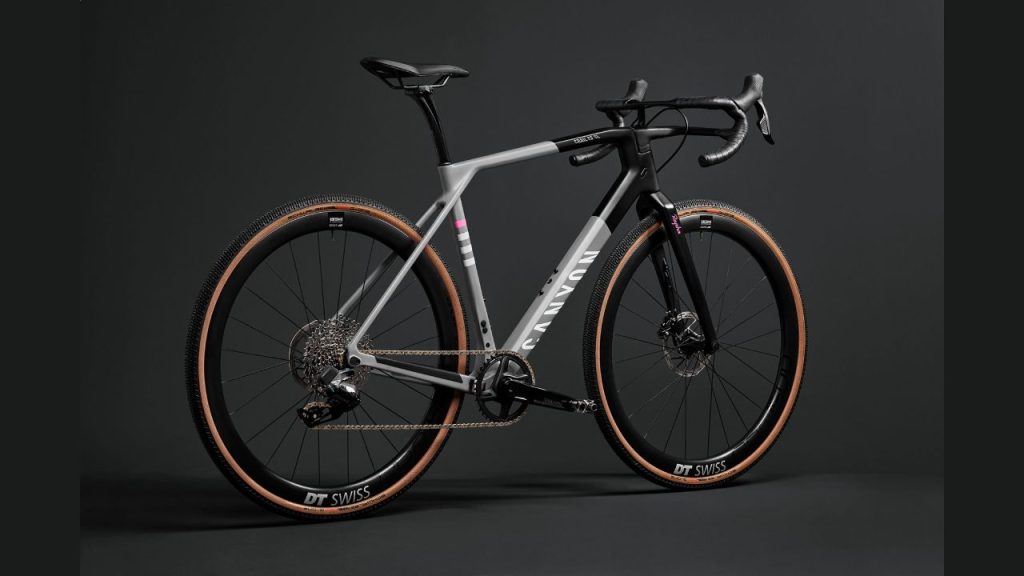 これが、ラファスタイルのグラベルライディング。ラファとキャニオンの長きにわたる特別なパートナーシップを記念して、このGrailバイクは世界限定100台のみ生産される。RCC(ラファサイクリングクラブ)の象徴的なクラブカラーであるピンク、グレー、ブラックを基調とした、センセーショナルでユニークなアートワークが特徴だ。