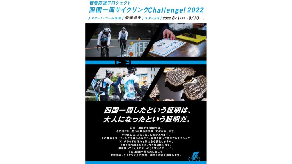 2022年3月、愛媛県庁前に四国一周のスタート地点となる「0kmモニュメント」が設置された。また、同年4月からは成人年齢が18歳へと引き下げられ、「大人の証明」となる精神的・社会的経験が求められるようになった。四国一周約1,000kmのサイクリングへの挑戦は、四国の風土を五感で感じ、自分を律し、また周囲の人とも助け合って「大人になる」ということを実感するための貴重な体験となるはずだ。
