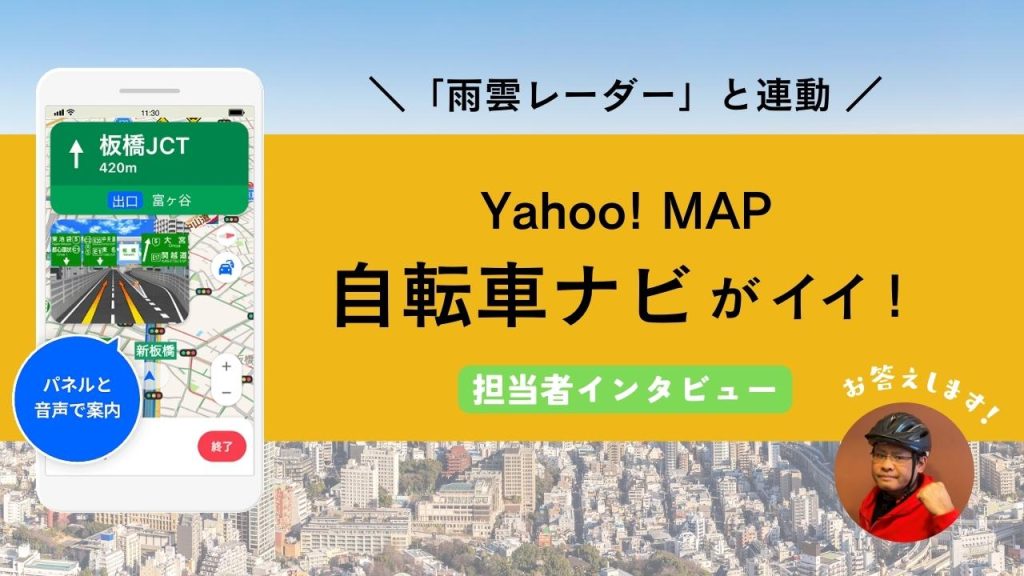 ひと目で簡単に表示される自転車用のルートはもちろん、ナビ中は音声と案内パネルでガイド、さらに「雨雲レーダー」の連動でライド行程における雨の予測が可能になった新しいYahoo! MAP。ポタリングが趣味だというプロジェクトマネージャーの渡辺太郎さんに、お話を聞いてきました。