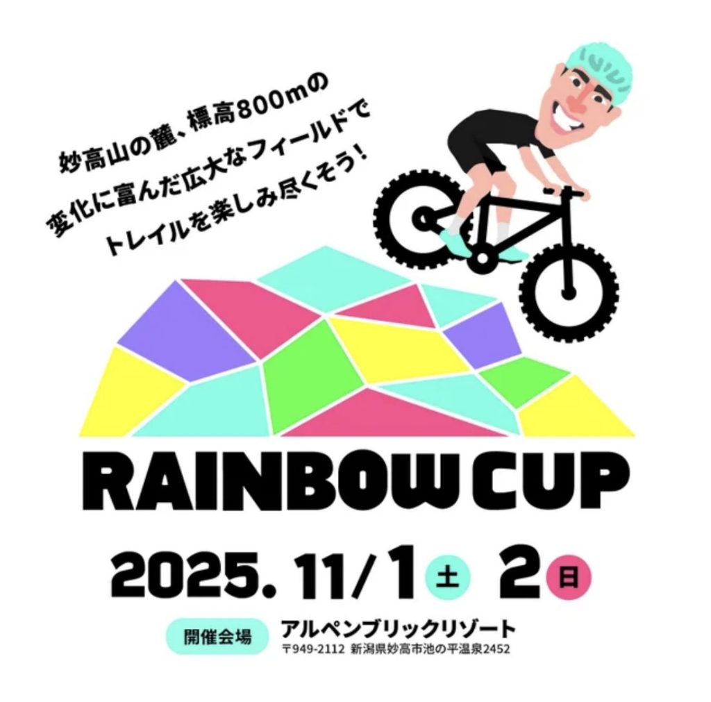 「RAINBOW CUP」は、子どもから大人まで幅広い世代が参加できるマウンテンバイクイベントです。主催はアジアMTB界のレジェンドであり、現在はAsia Union TCS Racing Teamの代表を務める 山本幸平。これまで長野県で開催されてきましたが、今年は初めて新潟県妙高市の「アルペンブリックMTBパーク」で行われます。